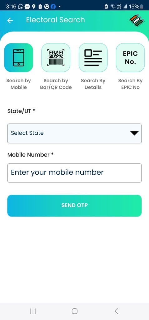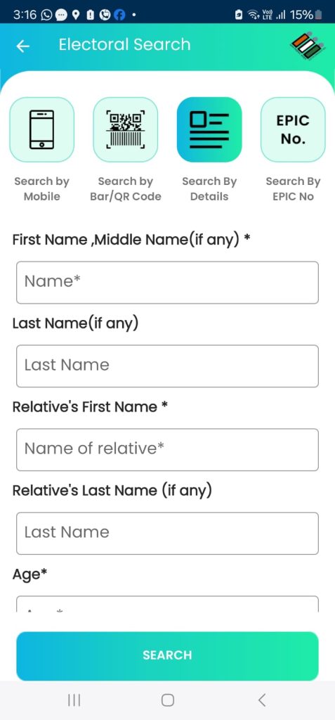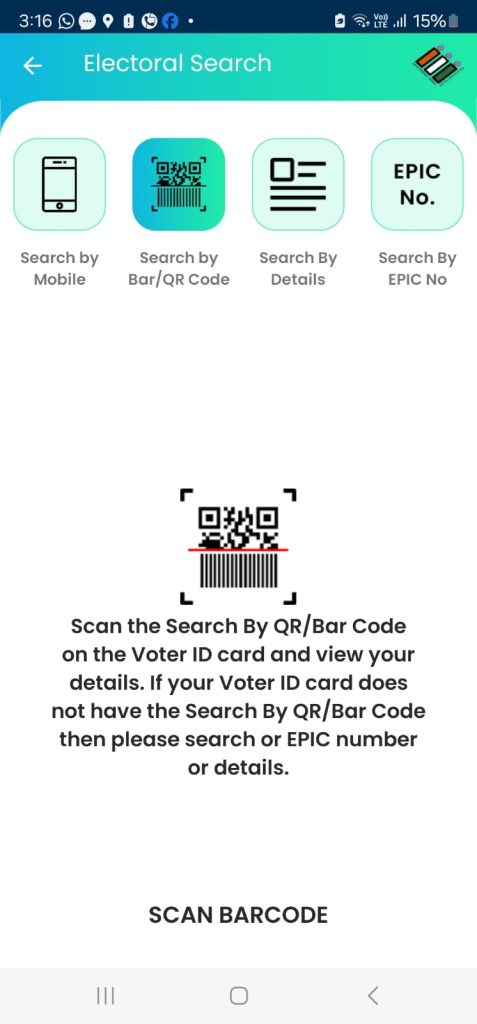 - Search by Bar / QR code (You can scan the Bar code on the Voter Id)