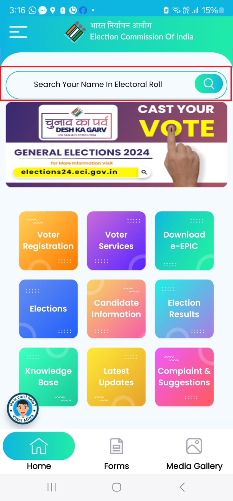 Step 2: Open the Voter Helpline App and click on “Search your Name in Electoral Roll” search box at the top (refer below screenshot)
