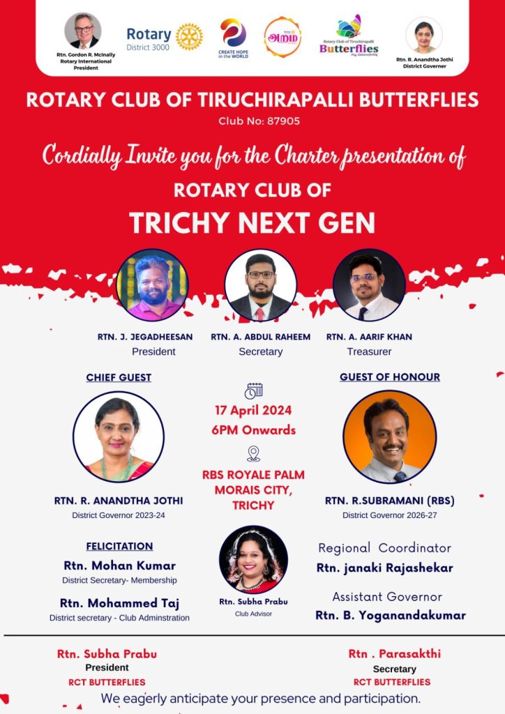 Rotary Club of Tiruchirappalli Butterflies (Club no 87905) President Rotarian Subha Prabhu launched the Rotary Club of Trichy Next Gen on 17th April 2024 at a grand event conducted at the RBS Royale Palm at Morais City, Trichy.